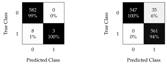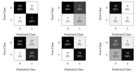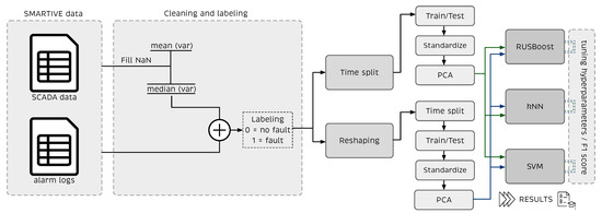 Data are first preprocessed using principal component analysis (PCA) to exploit the relationships between SCADA variables, followed by processing using techniques to deal with data imbalance. PCA is widely used in the literature, but for different applications and objectives. For instance, and in the field of wind turbines, PCA can be used as a visualization tool [28], to identify suitable features [29,30] or to perform a fault detection based on hypothesis testing [31,32]. This paper presents a comparative analysis between the results obtained using supervised ML methods such as k-nearest neighbor (kNN) and support vector machine (SVM) algorithms fed with processed data using time-split and oversampling techniques for imbalanced datasets. The results obtained using one of the most recent ensemble methods—a combination of random undersampling and the standard boosting procedure AdaBoost (RUSBoost)—was used as the baseline. This comparative analysis contributes to the state-of-the-art preprocessing techniques while proposing different methods for preprocessing data enhances fault detection in WTs. Furthermore, it provides a different perspective of what can be achieved using a small amount of data to minimize false alarms (or false positives ()) and undetected faults (or false negatives ()), while increasing the detection rate of real alarms (or true positives ()), minimizing costs, and contributing to the WT lifespan.