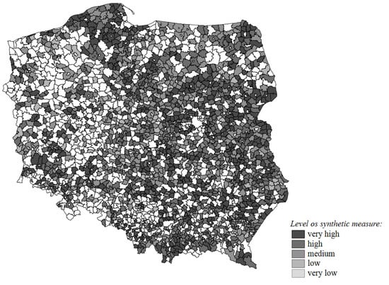 The determined values of the synthetic measure were the basis for the linear ordering of the rural communes examined according to its non-increasing values. Based on them, typological classes of Poland’s rural commune investment activity levels were distinguished arbitrarily by dividing the surveyed commune population into five classes: 0.80 < Si ≤ 1.00—class 1 (very high), 0.60 < Si ≤ 0.80—class 2 (high), 0.40 < Si ≤ 0.60—class 3 (average), 0.20 < Si ≤ 0.40—class 4 (low), 0.00 ≤ Si ≤ 0.20—class 5 (very low investment activity level). At the same time, substantive identification of the typological classes was carried out using active features (ones used in the construction of the synthetic measure value), as well as passive features—ones representing the socio-economic situation of the entities examined. The designated investment activity classes were the basis for the analysis of their links with their location within the macroregion, as well as their socio-economic status. For this purpose, a multi-dimensional table was used and the Chi-square statistic was calculated.