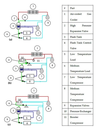 Global warming and its detrimental effects on the planet have forced action among scientists, politicians, and the general public. Among the efforts to tackle this problem includes replacing high global warming potential (GWP) refrigerants with lower GWP refrigerants in vapor compression systems used in the applications of heating, ventilation and air conditioning, and refrigeration (HVAC-R). One of the promising low GWP candidate refrigerants is carbon dioxide (CO2). Since CO2 is nontoxic and nonflammable, it is considered to be a very good refrigerant choice for commercial refrigeration applications in supermarkets and warehouses [,]. The major challenges associated with using CO2 as a refrigerant are its low critical temperature and high operating pressure. This leads to lower system performance at warmer ambient conditions and higher expansion losses, respectively. However, researchers are continuously improving refrigeration technology to overcome the lower system performance in warm and hot climates []. Figure 1a shows a typical CO2 vapor compression cycle. Heat is absorbed by the refrigerant in the evaporator to provide cooling. The refrigerant from the medium-temperature compressors enters a gas cooler/condenser and rejects heat to the surroundings. The refrigerant exiting the gas cooler/condenser is expanded through a high-pressure expansion valve before entering a flash tank for phase separation. The liquid refrigerant is split into two streams and further expands to the saturation pressure corresponding to the medium-temperature and low-temperature loads, respectively. After absorbing heat from the low-temperature loads, the low-temperature refrigerant is superheated by passing through the flash tank before being compressed in the low-temperature compressors. The low-temperature compression outlet mixes with medium-temperature refrigerant before both streams are compressed in the medium-temperature compressors.