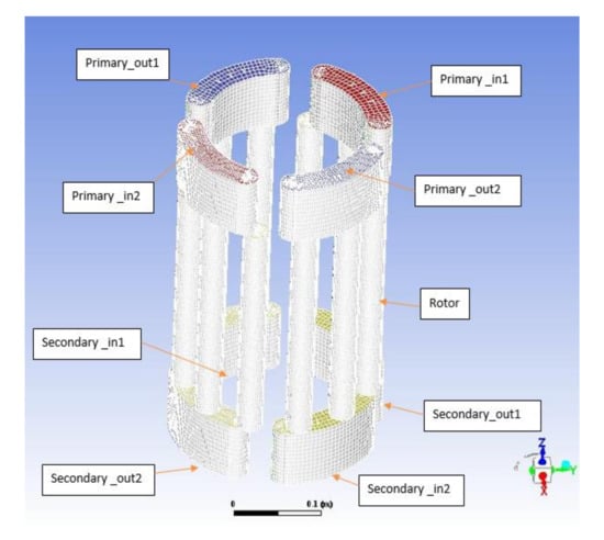 A 3D computer aided design (CAD) model for the pressure exchanger was developed, as shown in Figure 2. The model is inspired by the PX design found in RO systems. The model components and boundary conditions are illustrated in Figure 2. On one end of the PX, there are two sets of primary (high pressure) flow inlets and outlets, while on the other end of the PX, there are two sets of secondary (low pressure) flow inlets and outlets. The rotor of the PX was modeled with 9 channels. The PX model has the following dimensions: