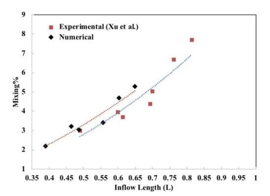 Percent mixing as a function of the dimensionless inflow length for the experimental and numerical results.