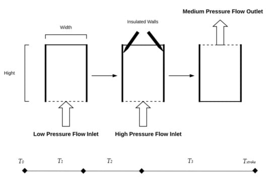 The schematic in Figure 4 shows the 2D pressure exchanger model and illustrates the processes of the compression stroke. The 2D model consists of two insulated sidewalls, and the system is assumed adiabatic. The bottom side of the system is the inlet port while the top end is the discharge port. Both low- and high-pressure flows enter the chamber through the same inlet. The simplified system is considered as an open type due to mixing inside the chamber. Hereinafter, the high-pressure flow is referred to as the primary flow while the low-pressure flow is referred to as the secondary flow.
