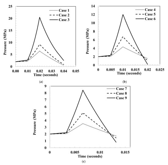 Figure 5a–c shows the total pressure variation during the cycle. One can observe that the profile trends are similar for the nine cases. The pressure gradually increases during the filling process, which lasts for one-fourth of the whole cycle. The average pressure at the end of this process shows a minimal difference among the cases. As one expects, the longer the charging process time, the higher the process final pressure. During the compression process, the primary flow is charged into the system and rapidly increases the internal pressure until reaching a maximum value at the end of the compression process. This second state represents the mixed flow final pressure.