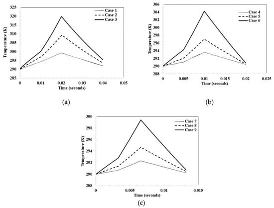 The average internal temperature for each process of the cycle are shown in Figure 6a–c. The profiles follow a similar trend as observed previously for the pressure profiles. The internal average temperature shows a slight increase during the filling process, followed by a sharp increase during the compression process. The temperature increase during the compression process decreases gradually at the onset of the discharge process. This monotonic behavior is observed for both the internal pressure and the temperature values. That is, the rate of increase of internal temperature is proportional to the increase in inlet velocity, while the increase in rotational speed has an inverse effect on the rate of increase of internal temperature. The highest increase in system temperature takes place at the end of the compression process and is approximately 29 K for Case 3, while the lowest increase is around 2 K for Case 7. The pressure and temperature profiles clearly predict the thermodynamic behavior of the cycle.