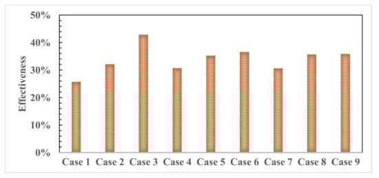 The cycle effectiveness is plotted in Figure 7. The first observation is that all the effectiveness values are positive, which indicates energy transfer between the two flows. The maximum effectiveness of 42.8% is achieved for the lowest rotational speed and highest inlet flow rate (Case 3), while the lowest positive effectiveness is 25.7% for Case 1. The inlet velocity/flow rate positively affects the system’s effectiveness at a given rotational speed. Similarly, the temperature difference monotonically follows the effectiveness trend. This is due to the direct proportionality between the temperature and pressure increase inside the constant volume system. Another observation is the comparable value of effectiveness at a given flow rate for the highest rotational speeds (Cases 4 and 7, Cases 5 and 8, Cases 6 and 9). This is due to the longer process time associated with lower rotational speed. The compression process duration is directly proportional to the pressure ratio.
