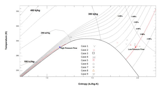 To have a more clear understanding of how the energy recovery cycle can enhance the performance of trans-critical CO2 refrigeration cycle, the mixture outlet state for all cases is plotted on the temperature-entropy (T-S) diagram for CO2 and presented in Figure 8. The low- and high-pressure flows used in this study are marked on the chart. The low-pressure flow represents the flow condition at the compressor suction side and the high-pressure flow represents the flow at the gas cooler exit. The outlet flow state is found to be located in the superheated flow region for all cases except for Case 3 where the flow is in the supercritical region. As seen in the figure, the outlet flow from the exchange process has gained pressure except for Cases 7 and 8 due to the short process time and the high flow rate. The exchange process is able to generate a single-phase flow which can be directed to the compressor without the need for a separation stage. One can see that the exchange process is customizable to reach the desired flow conditions by controlling the flow rates and rotational speed.