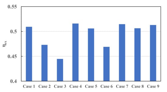 where is the reference temperature, h is enthalpy, S is entropy, and is the mass flow rate. The exergetic efficiency is calculated and displayed in Figure 9. It is noted that the exergetic efficiency decreases with the increase of flow rate (i.e., Cases 1–3 and Cases 4–6). This indicates an increase in the exergetic losses. However, this trend is not consistent at the highest rotational speed (Cases 7–9). A plausible explanation for this behavior is that, at the highest system rotational speed, the losses imposed by the system rotation are much higher than the losses caused by the inlet and outlet flow. Therefore, the exergetic efficiency is comparable for Cases 7, 8, and 9, whereas for the lower system rotational speeds, the generated losses due to the flow are relatively more pronounced.