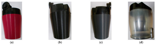 The dimensions of the containers were comparable (see Figure 7a). The circulatory (swirling) air movement inside the containers (see Figure 7b) was obtained using an OK-1680 type blower with a power of 1400 W that adjusted airflow in the range of 1.27–2.19 m3/min cubic meters per minute, (cpm) generating a suction of 21 kPa. In the containers shown in Figure 6 the air is introduced tangentially to their center and circulated in a cyclone manner. The blower drew the air from the containers through an outlet opening in the suction head (Figure 6e), which caused the particles placed in the container to whirl due to the cyclone effect. A cylindrical filter (Figure 6b) with a diameter of 70 mm and a length of 100 mm was placed at the outlet head. As a result, the usable volume of the containers used in the tribocharging process is about 0.7 L. The filter attached to the outlet head protects the plastic particles from being sucked out by the blower. In the tribocharging process of both polymers, containers made of poly(ethylene terephthalate) glycol-modified (PET-G), acrylic-styrene-acrylonitrile copolymer (ASA) polypropylene copolymer (PP), acrylonitrile-butadiene-styrene (ABS), and polylactic acid (PLA) were used.
