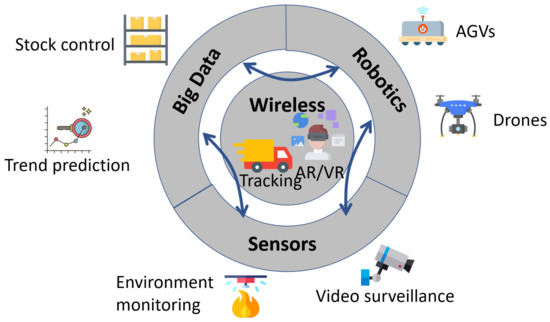 All the challenges shown above put a pressure on supply chains that requires a higher flexibility for an efficient and economically feasible operation. Supply chains must be prepared for quickly changing parameters. In the case of customized, small run products that imply the transport of small batches over large distances, supply chains must be able to act more like postal services rather than traditional retail logistics. Smart Logistics adopts Industry 4.0 principles to add flexibility to easily adapt to changes both at large and small volumes of moving stock. In Smart Logistics, warehouses are switched for distribution centers [66], where small batches of products (or even individual units) are received, stored for very short periods of time (days or hours), and redirected to the next distribution center. Distribution centers, hosting many Industry 4.0 applications, act more like advanced post offices, rather than long-term warehouses.