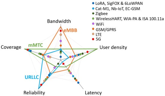 Although all these technologies are used, as summarized in Figure 2, their capabilities are insufficient for some novel Industry 4.0 applications, such as Augmented Reality (AR) [35], Automated Guided Vehicles (AGVs) [36], etc. Technologies that have been designed for low-power IoT, such as LoRA, SigFox, 6LoWPAN, Cat-M1, Nb-IoT and EC-GSM, fulfill the needs of coverage (in difficult places such as underground or inside containers) of some applications, but cannot cope with a high user density. LTE was designed as a broadband access technology, although its highest data rate (100 Mbps in the downlink, 50 Mbps in the uplink) is not high enough for the most extreme industrial applications. No current technology, apart from 5G, can cope with the latency and reliability requirements of certain applications such as closed loop control or safety systems. To support novel, highly demanding applications, research for future 5G technologies has Industry 4.0 as one of the main verticals [37]. Consequently, novel solutions for optimizing the quality of service [38,39] for specific IIoT applications, as well as energy consumption [40] have been published.