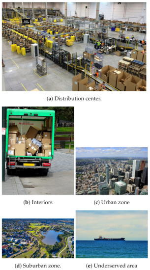 - Interior spaces are very varied in logistics, ranging from the interior of buildings, where delivery is done, to tight spaces such as shipping containers and delivery vehicles (as shown in Figure 4b). The difficulty of communications [76,77] depends on the type of container, the materials, and the location of gNBs and the composition of the surrounding packages. Within some buildings and vehicles, interior cells may improve connectivity.