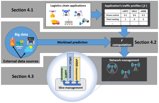 Each of the three described traffic profiles have very distinct requirements and the techniques that optimize the network are different and often incompatible. To some extent, it can be considered that each traffic profile requires a separate network. 5G is the only WAN network that can support all of these profiles by means of Network Slicing (NS) [41,55,56]. NS allows an efficient division of resources among subnetworks with very different configurations that may act as independent networks. NS can be used to provide services to the three traffic profiles without the need of deploying additional resources. NS is dynamic, so there are no static divisions and changes can be done quickly to adapt to changing conditions. With this mechanism, the problem to solve is to decide what amount of each resource should be assigned to each slice. A possible approach to this problem is to use prediction algorithms [57] that allow for knowing in advance how the traffic will be distributed among the three basic profiles. This knowledge must also take into account the specific aspects of the scenario and its challenges and limitations, and currently there are no studies following this line for logistics.