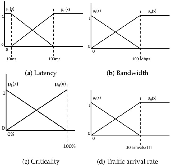 The first step in Figure 6 (fuzzification) is to translate the input numeric values of the previously described variables into human understandable values (also known as fuzzy sets) such as “high” or “low”. In Fuzzy Logic, this is done with membership functions, which, given a value in the domain of the numeric input, return a value between 0 and 1. The higher the returned value, the higher the membership of that value to a fuzzy set. Figure 7 shows the membership functions for the high and low sets for the latency, bandwidth, criticality, and traffic arrival rate. These membership functions may change as novel applications with different requirements hit the market, and future network generations allow for more capable communications.