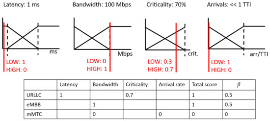To illustrate the process, Figure 8 shows an example where an AR application is modeled. To avoid dizziness, AR requires that updates are done very fast, implying delays down to 1 ms. To allow high quality video to be transmitted in a very short time, a bandwidth of up to 100 Mbps is required. The criticality of AR is not extreme (i.e., its malfunction is not a hazard to human lives), but still high (70%), since packet losses may cause a very poor user experience. Finally, the traffic arrival rate is low; much lower than one new connection per TTI. When these numbers (represented as red lines in Figure 8) are fed into the membership functions, the values for the HIGH and LOW sets are obtained (represented as the red numbers). These values are then used in the fuzzy rules. In Figure 8, the table shows the degree of truth of each assertion of the rules in Table 1, the total DoA of each rule and the normalized values for the vector.