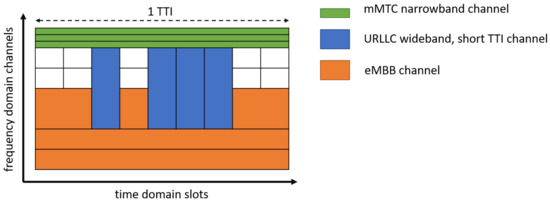 - Popovski, P.; Trillingsgaard, K.F.; Simeone, O.; Durisi, G. 5G wireless network slicing for eMBB, URLLC, and mMTC: A communication-theoretic view. IEEE Access 2018, 6, 55765–55779. [Google Scholar] [CrossRef]