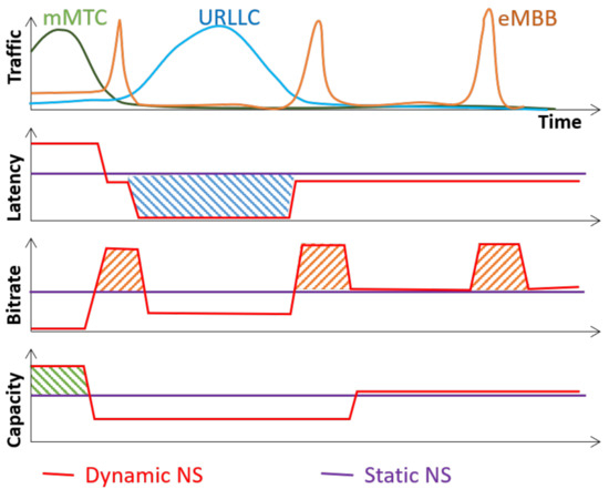 All these applications have traffic that can be classified in one of the three main traffic profiles described in Section 2.2. This may cause conflicting requirements that can be solved through the use of Network Slicing (NS). Since the activity in the different locations of a supply chain (e.g., distribution centers) varies through time in the short term (because of the hour of the day or the influx of parcels) and in the long term (marketing trends or changes in the floor plan), the traffic load that each gNB may also support changes. Not only does the volume of traffic change, but also the proportion of traffic of each kind.