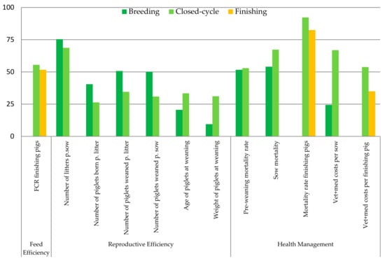 Pannell and Glenn [32] stress the importance of a sound conceptual framework to underpin the choice of economic sustainability indicators. They argue that the utility of sustainability indicators relates to their value as an input for better managerial decision-making. Technical performance indicators concerning feed efficiency, animal health, and fecundity are crucial because of their accepted contributions to financial performance in pig production.