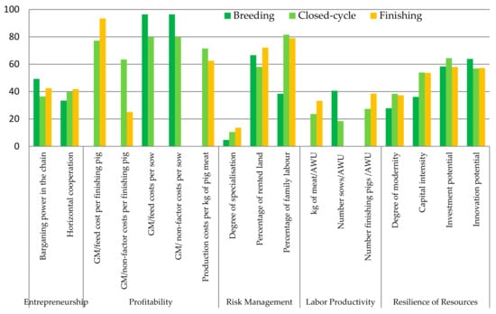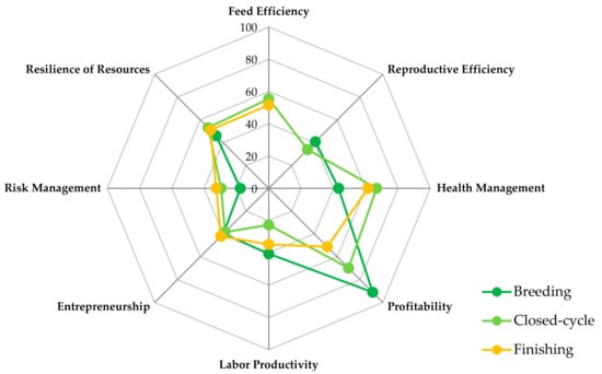 As a part of the test for the newly developed methodological approach, the hypothesis that closed-cycle farms might be more economically sustainable than those farms that are specialized in piglet production (breeding) or growing–finishing was tested. The results showed that closed-cycle farms do indeed have advantages in terms of raising healthy animals and having slightly better overall resilience of resources, however breeding and finishing farms appeared to be more sustainable in the areas of profitability, risk management, and reproductive efficiency. Thus, our hypothesis was not fully confirmed and requires further investigation.