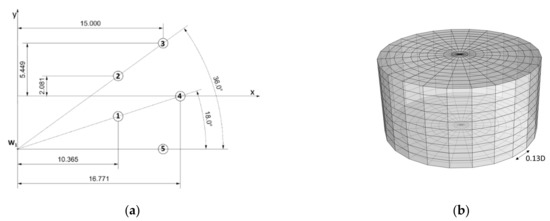 One wishes to attain the added mass and damping matrices as well as the excitation forces on the array including the interaction effects considering different undisturbed wave conditions (amplitude, period, heading, and phase) on each body. One cannot arbitrarily introduce different incoming waves on different points in WAMIT’s Equation (8) for the diffraction problem, but Equation (9) can be used by making one or more bodies act as (numerical) wave generators. In Figure 1a, body W1 is a small cylindrical body forced-oscillating with unit amplitude in heave at an angular frequency . This body’s geometry is a 1/8 scaled down version of the remaining bodies. Note that Figure 1a represents a view from above and that the relative sizes of bodies 1 through 5 and W1 are in scale.