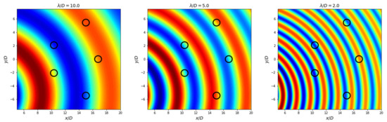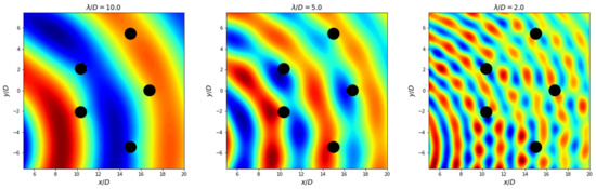 At this point, it should be clear that at no point in the interaction theory presented does the undisturbed incident wave filled at the bodies needs to be equal in amplitude, direction, or the phase equal to . The modification relative to [19,12] herein implemented is to consider prescribed and possibly independent , , and for each jth body, instead of , and starting from Equation (9).