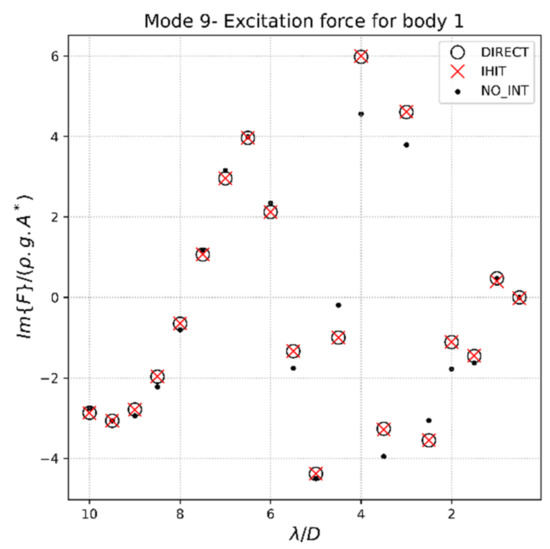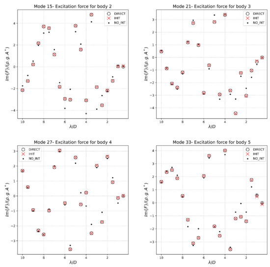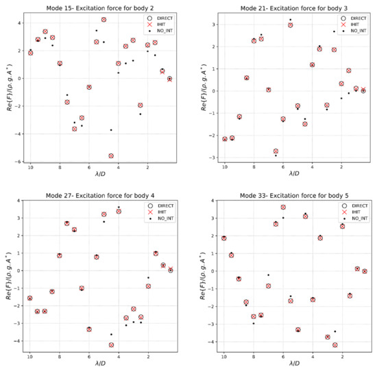 The results obtained are shown in Figure 4, Figure 5, Figure 6 and Figure 7. These correspond to the excitation forces’ real and imaginary components, the added mass, and the radiation damping, respectively.