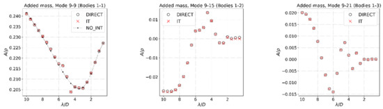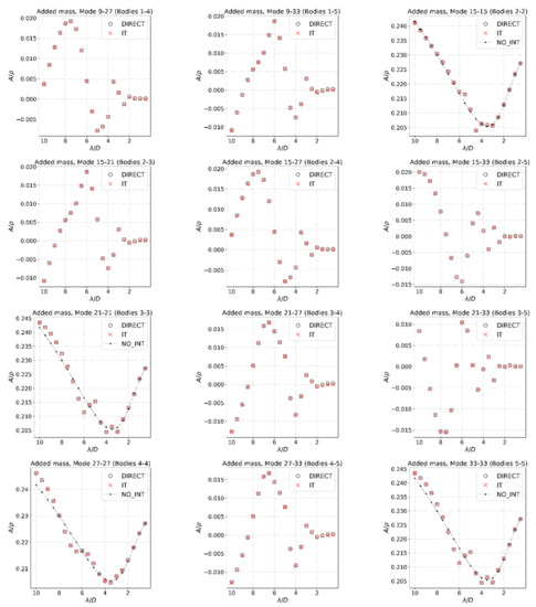 Added mass coefficients for heave motion. “DIRECT”, “IT”, and “NO_INT” denote the solution using WAMIT with the direct method, the solution using the interaction theory, and the solution for a single isolated body using the direct method and body , respectively. A denotes the added mass and ρ stands for the fluid density.