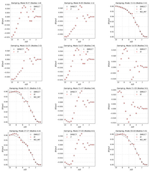 Irrespective of the origin of the error amplification, it is important to bear in mind that for wavelengths of this order (or shorter), the diffraction forces are close to zero and the radiation couplings between the bodies are likewise negligible (see Figure 4, Figure 5, Figure 6 and Figure 7). Therefore, one can use the procedure herein described, deeming the verification excellent for practical cases. Here, it is worth to note that for the other frequencies studied, the error typically increased from about 0.1% to a maximum of 0.9% as the frequency increased, while the isolated body approximation had errors in the range of about 10–40% (see Figure 8b). It is also worth mentioning that it is always possible to simply use the no-interaction approach for wavelengths outside the range where multi-body interaction is significant.