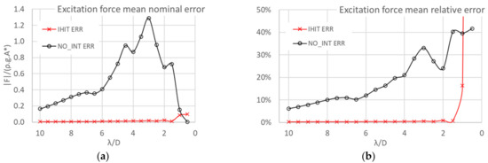 Mean error throughout the bodies for the excitation forces. “IHIT ERR” and “NO_INT ERR”, denote the mean error using the interaction theory with inhomogeneous wave field, and the mean error using the direct method only with an isolated body and body , respectively. The nominal error is the magnitude of the (complex) vector connecting the solution obtained with that of the multi-body reference direct method (a); the relative error is the nominal error divided by the magnitude of the reference value (b); the values in (a,b) correspond to averages of these quantities.