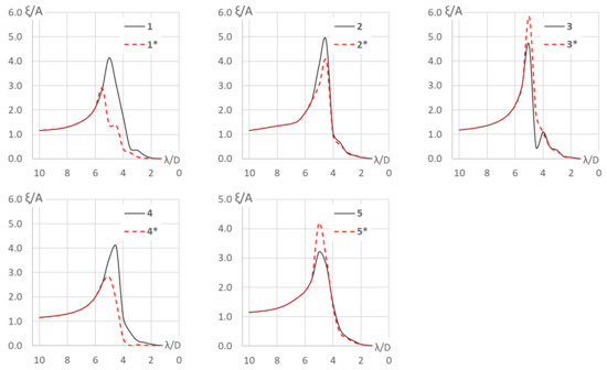 Heave motions with only wave radiation damping. “1–5” and “1*–5*” denote full wave field and local frequency truncated wave field at bodies 1 to 5, respectively. ξ denotes the heave motion amplitude and A stands for the local incoming undisturbed (full wave field) wave amplitude at each body.