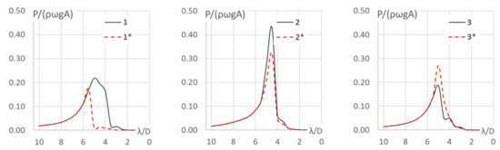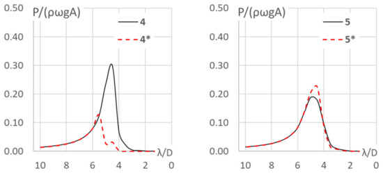Likewise, the absorbed power in both configurations is shown in Figure 10, where a PTO damping equal to each body’s radiation damping at λ/D = 5.0 is applied.