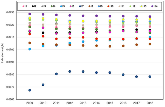 - To determine weights by the entropy weighting method for each indicator, according to relations (3) and (4):where: