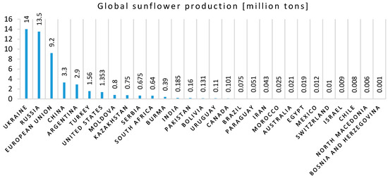 Global sunflower production 2020/2021 based on the United States Department of Agriculture (USDA) [33].