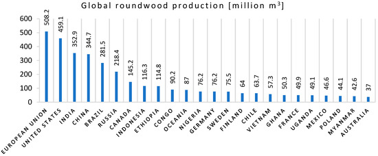 - UNdata, FOASTAT, Food and Agriculture Organization, Global Roundwood Production 2019. Available online: http://data.un.org/Data.aspx?d=FAO&f=itemCode%3a1861 (accessed on 10 February 2021).