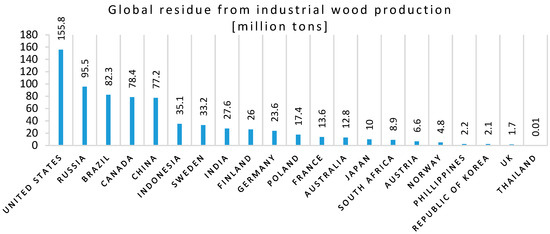 Sunflower is usually grown for its fruit (seeds) for human and farm animal consumption, but also for the edible oil. About 21–30% of the total weight of seeds are shell sunflowers, so their annual production is in the range of about 9.45–13.5 million tons per year [35]. On the other hand, about 3964.3 million m3 roundwood production worldwide was recorded in 2019 (Figure 2) [36]. The total waste from industrial wood production in 2013 was estimated at around 715 million tons. Among the countries generating the most wood waste, the following ones can be distinguished: USA (155.8 Mt), Russia (95.5 Mt), Brazil (82.3 Mt), Canada (78.4 Mt), China (77.2 Mt), Poland (17.4 Mt) and others (Figure 3) [37]. Wood waste is mainly sourced from a variety of sources, such as wood packaging, demolition and construction activity, the wood industry, municipal waste, imported wood and others, e.g., private households and railroad construction [38]. In accordance with the literature, approximately 25–30% of the total weight of processed fruit, vegetables and other plant raw materials is waste from the food industry [39]. This huge amount of waste needs to be recycled and an alternative could be to incinerate it to reduce waste weight and produce FA. One potential application of FA from incineration of sunflower and wood waste could be the use in adsorption processes to remove metal ions from wastewater and improvement of water quality and the purity of aquatic environment.