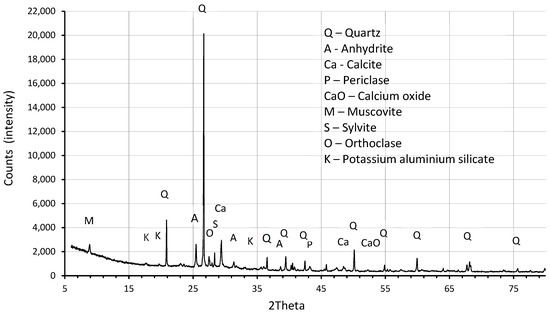 X-ray diffraction of the sample was performed and the diffraction pattern is shown in Figure 5. Based on the analysis, it was shown that the following substances are the main crystalline phases of SW-FA: quartz (synSiO2, 48.17%), anhydrite (synCaSO4, 13.68%), sylvite (synKCl, 11.86%), calcite (Ca(CO3), 7.16%), potassium aluminum silicate (Al3Si3O11, 6.73%), muscovite (KAl2(AlSi3O10)(F,OH)2, 5.14%), orthoclase (KAlSi3O8, 3.66%), calcium oxide (CaO, 3.16%), periclase (synMgO, 0.43%). It should be mentioned that the sample is a combustion product and exists as a heterogeneous mixture. Hence, X-ray diffraction analysis of a sample taken elsewhere from the tank after a combustion process may reveal a different quantitative composition, but the crystalline phases of the substances should be the same. The XRD analysis was similarly noticed in the literature [35,47]. Brännvall et al. reported that fly ashes are prone to aging processes that take place when the materials are not in thermodynamic equilibrium with various conditions. The aging is influenced by various parameters, such as redox potential, pH, temperature, humidity, the concentration of some substances in the environment, resulting in several chemical and mineralogical changes. These may be as follows: hydrolysis or hydration of K, Na, Ca, Al oxides, precipitation or dissolution of salts and hydroxides, formation, reduction and oxidation solid solutions, neoformation of clays as well as carbonation. Understanding these various transformations is essential as they can affect leaching or immobilization of hazardous substances by changes in pH, increasing or weakening mechanical stability of construction materials. In addition, aging influences the acid neutralization capacity (ANC), which is a parameter that indicates the rate of pH changes that occur when FA is affected by contact with landfill gas containing up to 50% CO2 or acidic conditions (e.g., acid rain) [48].