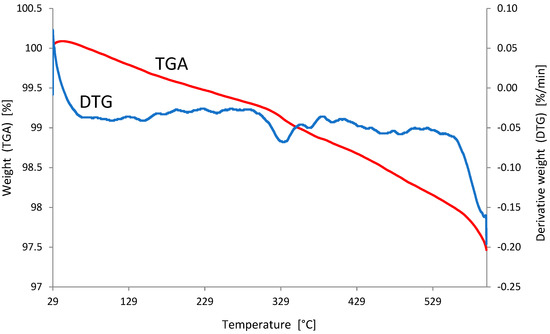 The SW-FA material was subjected to thermogravimetric analysis and the graph is presented in Figure 6. In general, with increasing temperature, the weight loss of the sample is observed in the temperature range from 30 to 600 °C. In the case of TG curve, denoting a change in the loss of mass, the total mass loss was about 2.53% and it was rectilinear and constant. This may be related to the get rid of adsorbed water from the SW-FA as well as carbon monoxide and volatile components, e.g., organic compounds that may have condensed on the sample. Other reaction may be associated with dehydroxylation of calcium hydroxide [45,53]. The SEM-EDS analysis indicated the presence of carbon, calcium and oxygen in the SW-FA after the combustion process. It can be assumed that oxidation of carbon to carbon dioxide took place at temperatures below 700 °C (reaction Equation (7)). As a result of the thermogravimetric analysis (TGA) there is also a further weight loss in the range 500–600 °C, which can be explained by the decomposition of CaCO3 into CaO and CO2 (reaction Equation (8)) [46,47,54]: