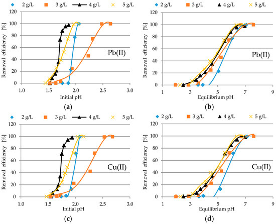 The dependence between initial (a,c) and equilibrium pH (b,d) and removal efficiency of Pb(II) and Cu(II) ions with SW-FA.