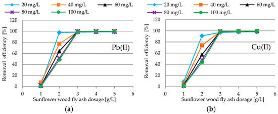 The impact of initial concentration of Pb(II) (a) and Cu(II) (b) ions on SW-FA removal efficiency.