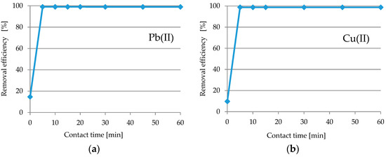 The impact of contact time on the Pb(II) (a) and Cu(II) (b) ions removal efficiency.