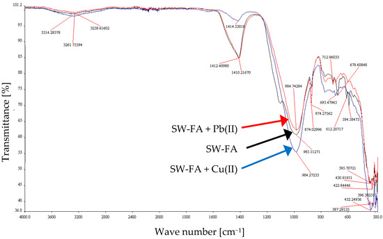 FT-IR analysis of SW-FA was carried out before and after the adsorption process, and the corresponding spectra are presented in Figure 12. The following experimental conditions were used in this study: SW-FA dose 5 g/L, initial concentration of Pb(II) and Cu(II) ions 10 mg/L, initial pH 2.0, T = 23 ± 1°C, contact time 60 min. The explanation of FT-IR peaks and their wavelengths are explained in Table 5. The spectra were interpreted before and after the adsorption process, taking into account the intensity of bands, frequency, shape differences and possible interactions of functional groups with Pb(II) and Cu(II) ions. As it is seen in Figure 12, after the adsorption process, the intensity of the bands changed towards other transmittance values. The positions of the bands were either at the same wavelengths or slightly shifted. These changes are as follows: 3261.76 (shift to 3258.62 cm−1 (Pb(II)) and 3314.28 cm−1 (Cu(II))), 1412.41 (shift to 1410.22 cm−1 (Pb(II)) and 1414.53 cm−1 (Cu(II))), 985.11 (shift to 984.74 cm−1 (Pb(II)) and 984.27 cm−1 (Cu(II))), 874.03 (shift to 874.28 cm−1 (Pb(II)), 678.61 (shift to 712.96 cm−1 (Pb(II)) and 693.48 cm−1 (Cu(II))), 430.92 (shift to 422.84 cm−1 (Pb(II)) and 432.25 cm−1 (Cu(II))). The peak shifts are a consequence of the interaction and binding of metal ions with functional groups present on the SW-FA surface and confirmed by the XRF analysis. Comparing these results with literature, for example FA from the combustion of wood chips and deciduous trees waste was used for FT-IR research. There was reported similar bands related to the following vibrations: asymmetric stretching Si-O (1110 cm−1, 1044 cm−1), symmetric stretching Si-O-Si (796 cm−1), symmetric stretching Al-Si-O (571 cm−1), bending O-Si-O (467 cm−1, silica glass and quartz) [88].