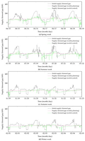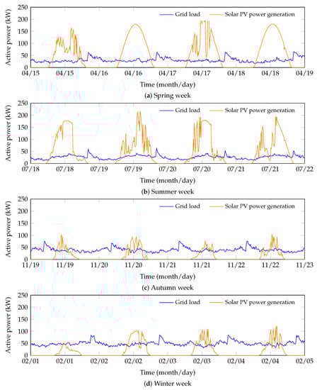The grid load (transformer-level measurements of power consumption in a suburban neighbourhood composed of approximately 120 households) and solar PV power generation (50 household PV panels) over four “season-typical” weeks: a spring week (a); a summer week (b); an autumn week (c); and a winter week (d).