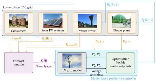 Figure 2 summarises the proposed MPC-based strategy. At each time step, the low-voltage power distribution grid model assimilates data coming from both the forecast module and the metering infrastructure concerning the biogas production at the biogas plant, water consumption affecting the stored water level in the water tower, solar PV power generation and the grid load. Then, the model evaluates the voltage constraints created in the grid and sends this information to the optimisation algorithm which attempts to find a solution for the flexible assets’ setpoints. Once the optimisation problem is solved, the first setpoint (for the following time step) is implemented. The entire process reiterates at every time step.