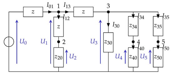 The equivalent electrical circuit of the low-voltage power distribution grid of the case study. Let z, , , , , , and be the line impedance (assumed identical for all grid lines), the impedances of the water tower’s pump (node 2), the consumers (node 3), the biogas plant’s generator (node 4), and the PV installation (node 5), respectively. is the voltage at the transformer level. , , , and are voltages and , , , , , , and are currents flowing between various grid nodes.