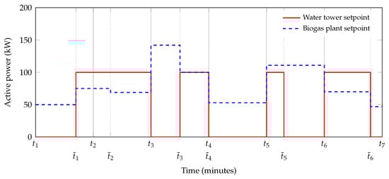 Figure 4 gives an example of what the water tower and biogas plant setpoints would look like with the switch control formulation. Note that the transition between states does not only occur at the beginning of each time step.