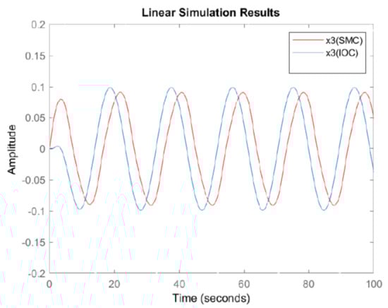 The unstable system in this example can be properly controlled by both sliding mode control (SMC) and inverse optimal control (IOC) to have bounded closed loop state responses. As shown in Figure 7, Figure 8, Figure 9 and Figure 10, for matched disturbance case in this example, when SMC is properly designed, its performance could be better than that of IOC because SMC can have smaller state responses in Figure 7, Figure 8 and Figure 9 by applying smaller control effort in Figure 10.