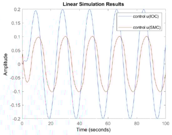Since both sliding mode control (SMC) [,] and the inverse optimal control in SDS system form are developed based on Lyapunov stability theorem and their performances are dependent on tuning their design parameters, we compare them in terms of conditions to use and limitations. SMC methods in [,] have low sensitivity to parameter uncertainties, can work with matched uncertainties as well as matched disturbance that enter into control inputs and apply discontinuous switching control law to ensure the finite time convergence. Those are their advantages. However, SMC methods in [,] may suffer from chattering phenomenon and when uncertainties and disturbance are not matched ones, the performance could be downgraded. On the contrary, the inverse optimal control method in Section 2.4 can handle bounded disturbance which are not from control inputs. As shown in Example 4, for system with matched disturbance, the SMC controller could use smaller control effort to obtain smaller state responses than IOC controller. However, from the implementation point of view, the structure of IOC controller is simpler than that of SMC controller and consequently the implementation cost of IOC controller could be cheaper. The inverse optimal control methods in this paper are suitable for controlling the system with precise parameters, such as the DC motor used for tracking control in Example 2. Therefore, designers can make tradeoff between IOC and SMC in terms of performance and cost.
