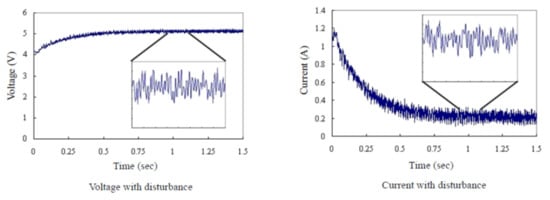 Regarding the future works, for implementation of the DC motor application in example 2, as seen in Figure 1, there is large electric inductance L in armature circuit in the model of DC motor. No matter what kind of sensor we use, one potential problem that is common in DC motor control is inductive kick (kickback) phenomenon or so called Ldi/dt voltages []. Since the windings of the DC motor will produce current conversion during commutation, the current conversion will cause the inductive kickback that disturbs both the voltage and current of armature circuit as shown in Figure 11. Therefore the measured voltage of L1 sensor in Figure 1 will also be disturbed.
