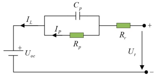 To optimize the charging current, a suitable battery model is needed. At present, the common method for studying battery characteristics is to establish a battery equivalent circuit model (ECM) or an electrochemical one. The electrochemical model is much more accurate, but it is so complex and computationally intensive that it is often used in battery designs, so ECM is adopted. Depending on the characteristics of the problem, the number of Resistor-Capacitance (RC) links is usually set to one or two. Further increasing the number of RC links increases the computational load without significantly improving the accuracy. In this paper, a first-order RC model was selected to achieve a good balance between model accuracy and computational complexity, as shown in Figure 1. is the battery open circuit voltage (OCV); is the battery terminal voltage; is the battery load current (assumed to be negative for discharging and positive for charging); and is the outflow current of . is the ohmic resistance; is the polarization resistance; and is the polarization capacity. The RC network consisting of and describes the mass transportation effects and dynamic voltage performance of the battery. The polarization voltage on and is represented as .