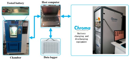 The experimental equipment included: (1) A Lithium-ion phosphate battery with parameters as listed in Table 1; (2) Chroma battery cell charge and discharge test system model 17,011 (Taoyuan, China); (3) A host computer; (4) Data logger. The Chroma 72,001 battery is used to charge and discharge the battery with a maximum voltage of 5 V and a maximum current of 20 A with an accuracy of 1 mV voltage and 10 mA current. It has eight independent testing channels as well as eight temperature acquisition sensors. The current, voltage are saved in real time by the host computer through TCP/IP interface and temperature data is saved by the data logger. The experimental setup is shown in Figure 2.