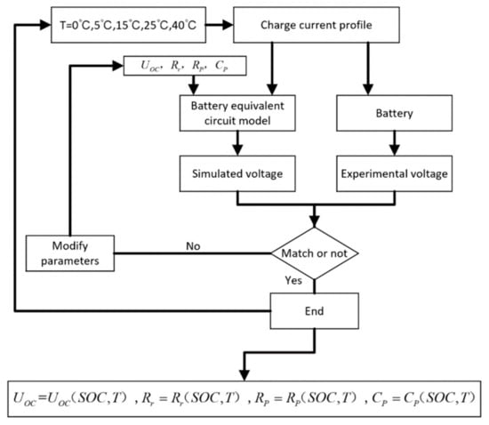 In this paper, the voltage and current changes of the battery during the charging process were obtained by pulse charging. The battery was emptied at 25 °C, and then the partial charge–rest phase cycle was carried out at five different ambient temperatures (0 °C, 5 °C, 15 °C, 25 °C, 40 °C). At the end of each 1.5 h rest period, the voltage can be regarded as the estimation of OCV, and SOC is calculated by Colombo counting method of current. Then the parameters of ECM are estimated by the algorithm of nonlinear least squares. The parameter estimation steps are shown in Figure 3. It is assumed that the change of cell impedance with current amplitude can be ignored [].